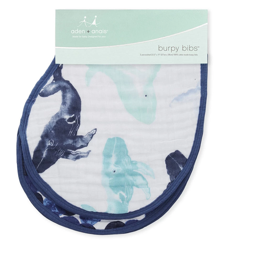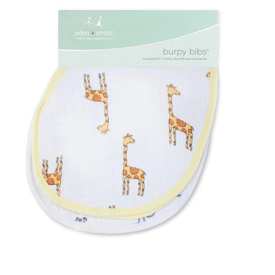 Pack of two 100% cotton muslin Burpy Bibs™. The four-layer, dual burp cloth and bib has a unique design that provides maximum coverage for baby and you.The versatile and durable Burpy Bib™ can be draped around baby’s neck, fastened with a simple snap in the back, and is easy to clean, with an open weave construction that allows for exceptionally quick drying times. In lovely, modern prints that are different on two sides, the Burpy Bib™ coordinates beautifully with other award-winning products in the aden + anais® collection.Great form meets versatile function in our soft, absorbent burpy bib. The special shape keeps things clean whether used as a bib or a burp cloth. Natural, gentle muslin is as easy to care for as it is to use. And no Aden & Anais product would be complete without Their chic, exclusive prints.