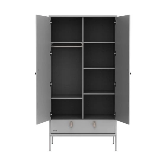 The Kidsmill Amy wardrobe offers a lot of storage space. On the left side of the door you will find two shelves and a hanging rail and behind the right door are three spacious shelves. The wardrobe is also equipped with a convenient drawer which guarantees extra storage space