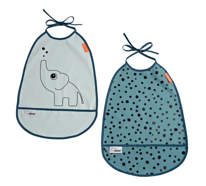 A set of two long pocket bibs. Let sweet Elphee and Happy dots keep your little one dry at meal time.
