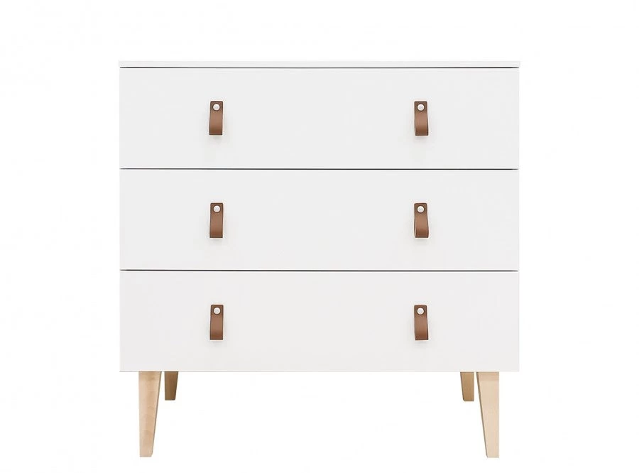 Chest of drawers from the Indy series with 3 drawers with leather handles. The chest of drawers rests on slender beech legs. Can be combined with the barrier Uno and the wall rack of the Indy series.