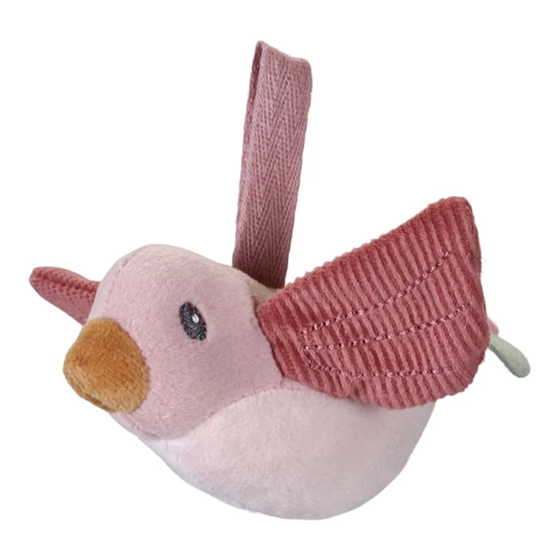 So much to see, feel and hear. Every day is a new adventure with this flower shaped play mat. The pink rug has two large corduroy bows with 5 different cuddly toys hanging from it. The bird, sparrow, flower and butterflies help little ones develop sensory skills and stimulate hand-eye coordination.