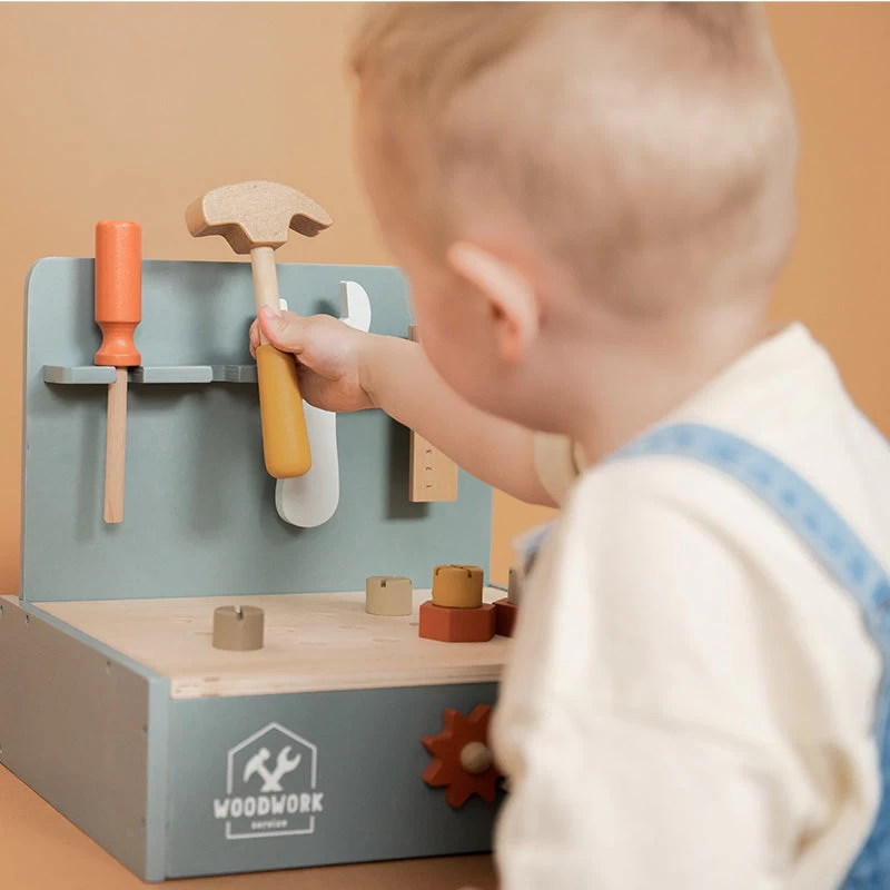 Do you like helping out with chores around the house? This mini workbench is compact and easy to move. That way, you can hammer, saw and build wherever you want. You can use the included screws and bolts to build a cool vehicle. Ready with your chore? Simply tidy up your tools and slide the wooden box shut. Use the mini workbench in combination with the big workbench for even more building fun! The set contains 26 components.