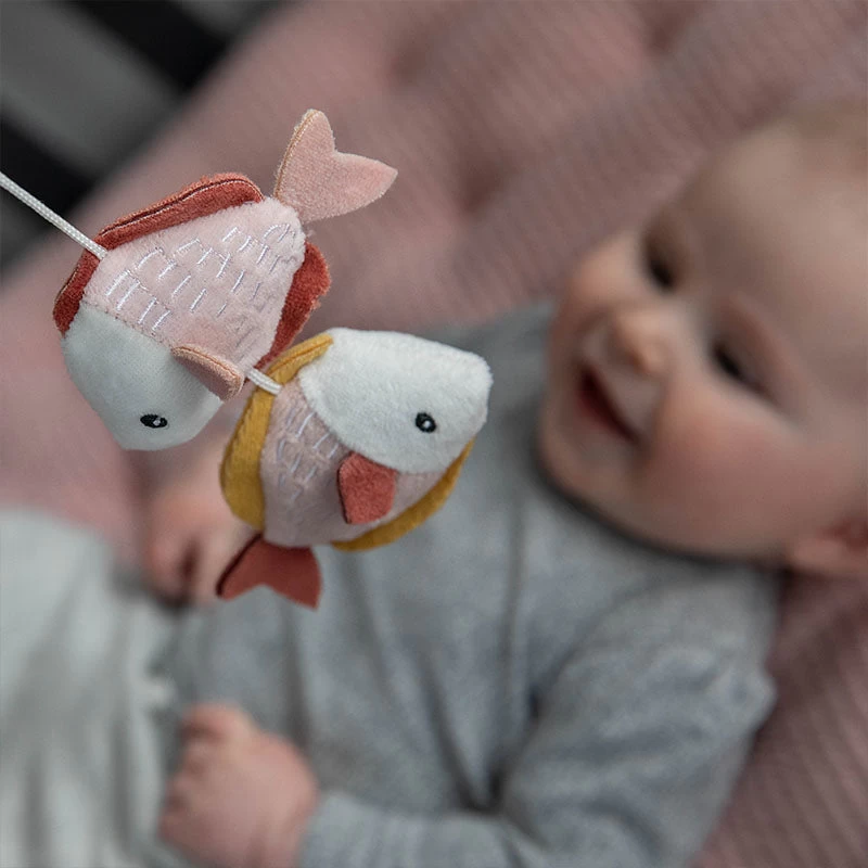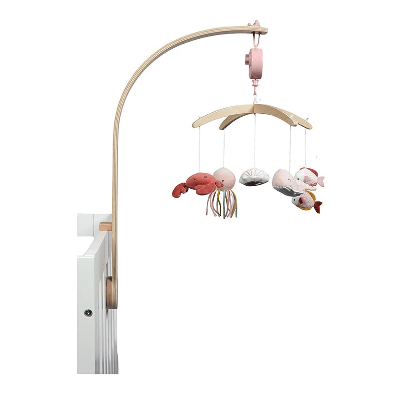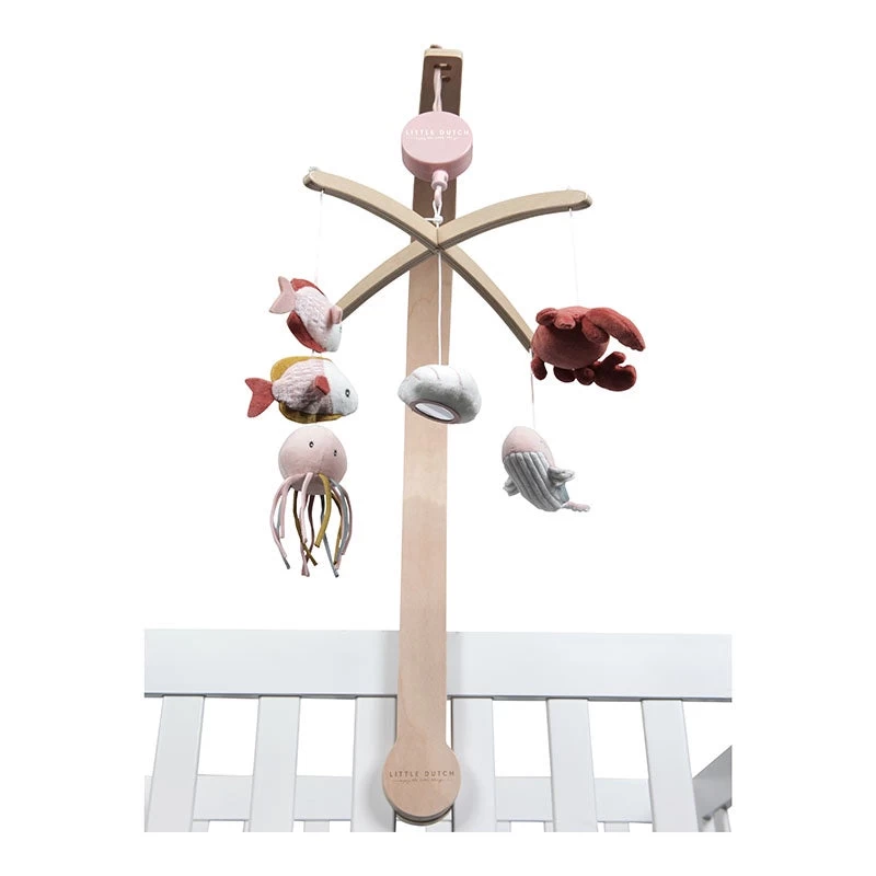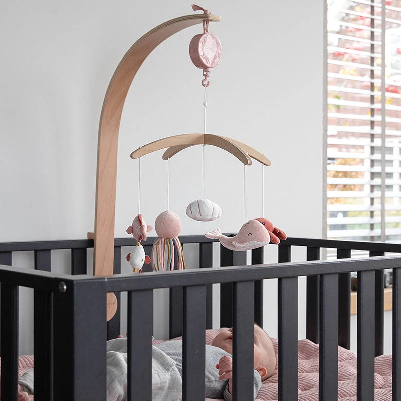 This beautiful wooden Little Dutch music mobile has a calming effect on babies thanks to the sweet lullaby. The mobile has five toys with the aquatic animals in the Ocean theme. Babies like to watch the movement of these toys, which stimulates their visual development. The music mobile is suitable from birth and easy to attach to the cot or playpen. Also available in white.