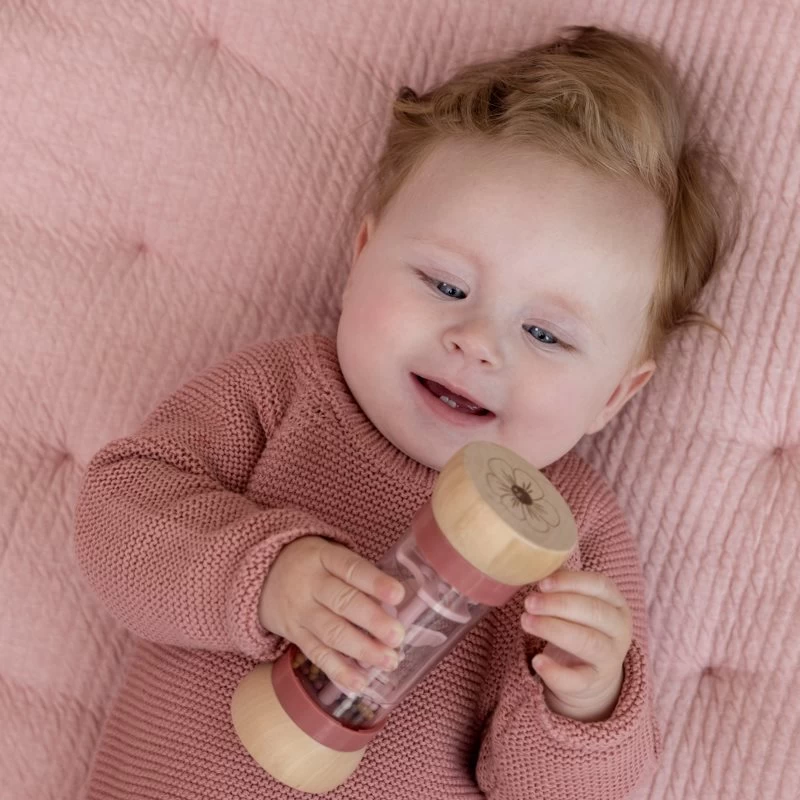 The beads in 3 different colours fall down the tube through small openings and make the propeller spin, resulting in a pleasant sound. The rain rattle is designed for little hands and an easy grip.