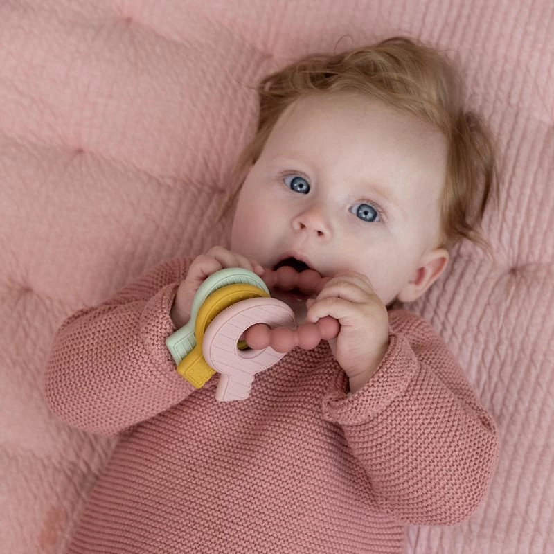 The appearance of the first teeth is a milestone but not always comfortable for your baby. To soften the pain we have created this multifunctional teething toy in the shape of a keychain. It is multifunctional: it’s a fun toy and it will provide soothing comfort and helps stimulate the eruption of your baby’s new teeth. The keychain has different textures which makes it challenging for your baby to chew on. It’s specially designed for little fingers to grasp!