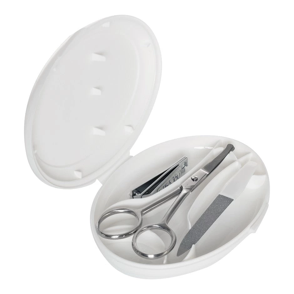 The baby manicure set of bébé-jou contains a file, nail clippers and stainless steel scissors. The special bébé-jou stainless steel baby scissors are long lasting and extra safe due to the special rounded ends. The baby nail file feels smooth and files the baby nails gently. These grooming products are essential for every day’s need. This case is very convenient to use, but also a handy size to put in your diaper or changing bag. And of course the plastic case can match all other bébé-jou products.